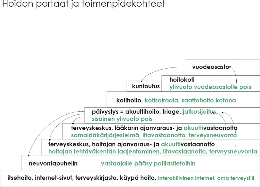 Mustalla on portaan kuvaus, sinivihreällä kehityskohteita ja nuolet potilasvirtoja. On lisäksi ollut tavallista, että potilas jää julkisessa terveydenhuollossa kalliimmalle hoitoportaalle, kun alempaa ei löydy tilaa; tämän pitäisi olla helpoin säästökohde.